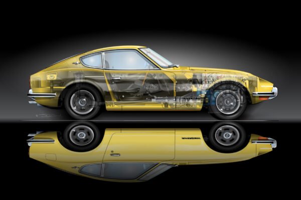 Not unlike a real car, the exterior color on a car in one of my illustrations can completely change the character of the drawing. The original artwork for the Datsun…