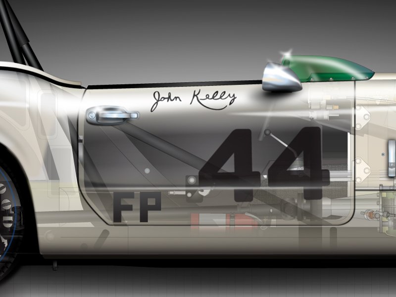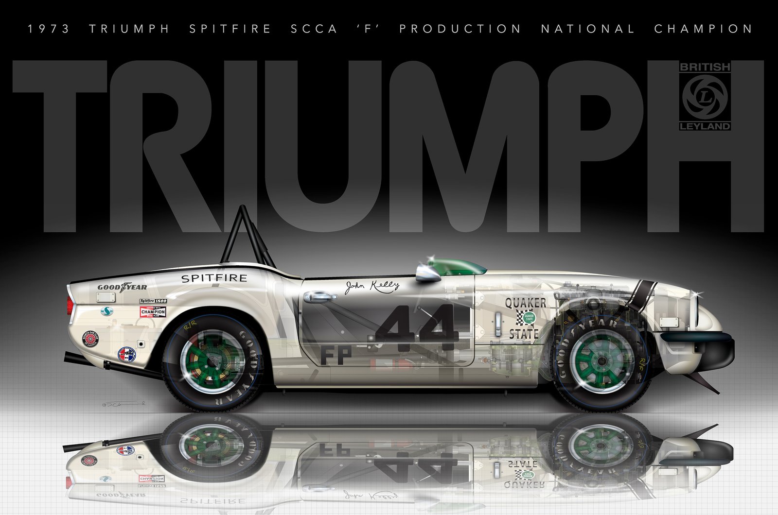 Now available, my freshly completed illustration of John Kelly’s 1973 “F” Production National Championship winning Triumph Spitfire 1500. I was fortunate enough, through the car’s current owner, to be able to confirm a few important details which included the style of exhaust‚side exit or out the back—as well as the style of John Kelly’s signature on the door. I was also blessed, once again, with the more than capable help of Steve Knoll who has become my “go to” guy for all things Group 44 related. I just can’t adequately express how grateful I am to be able to work with people who know about and care about these historic cars.