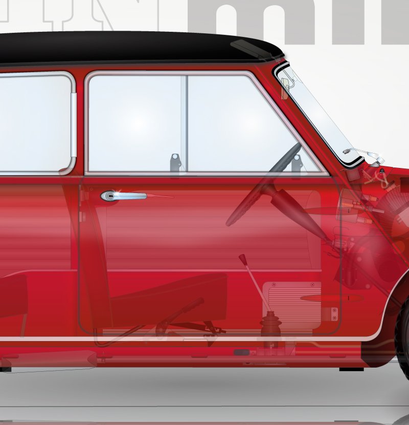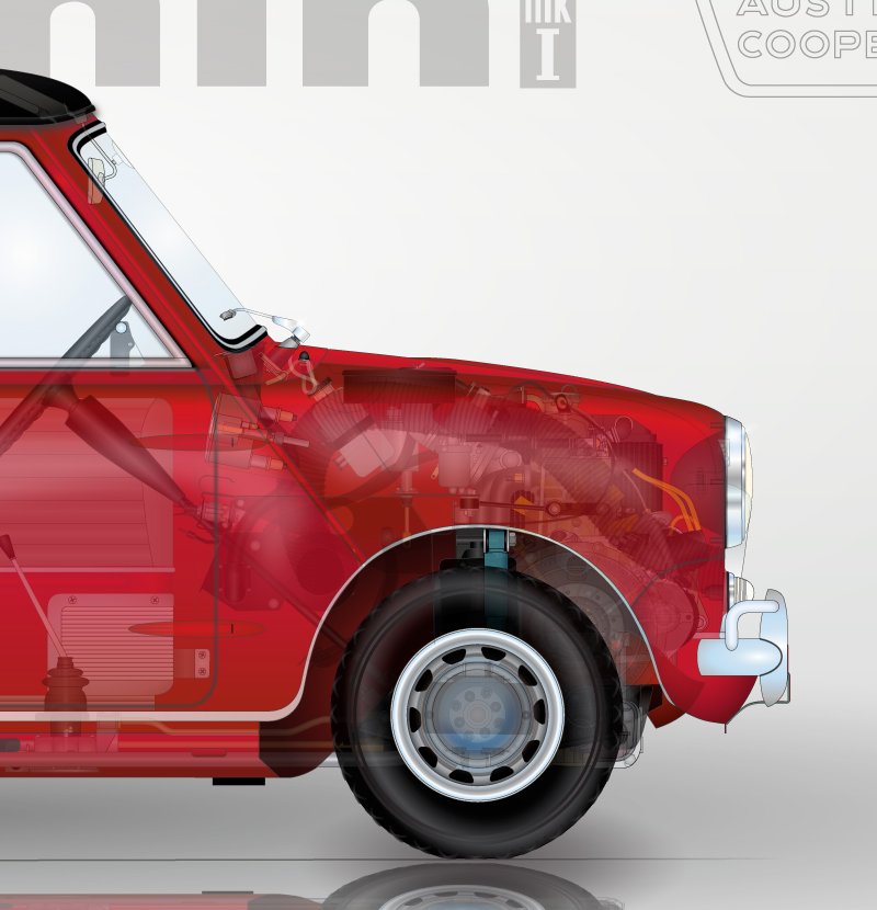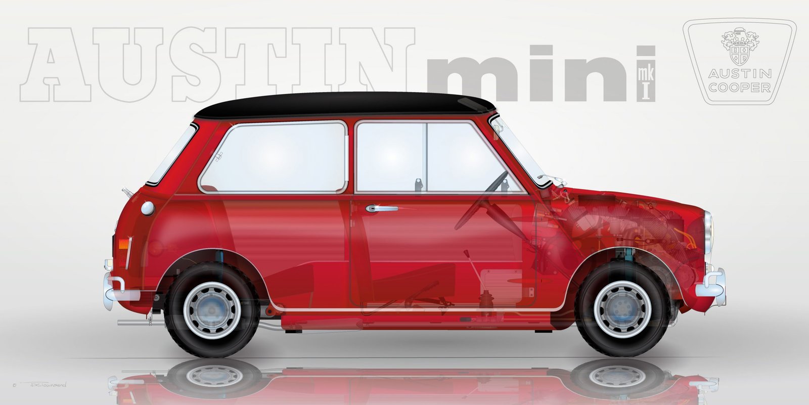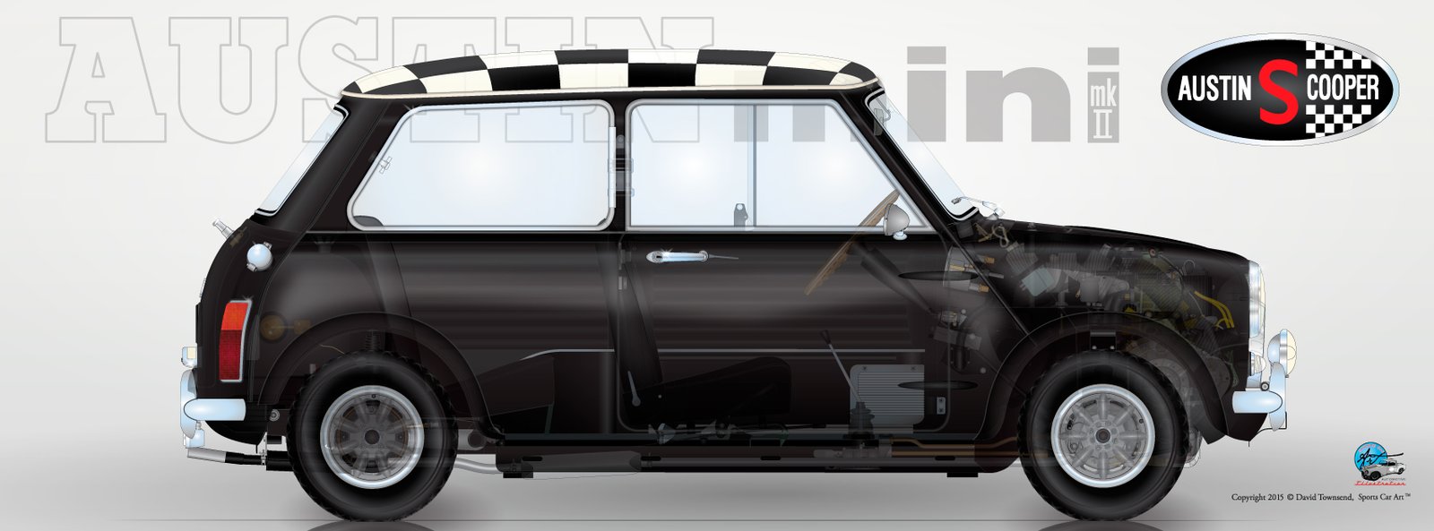 The Sports Car Art Austin Mini-Cooper MK I and Austin Mini-Cooper MKII limited edition fine art prints (only 100 of each will be pressed) come standard in left-hand drive with hydrolastic suspension, factory steel wheels, non-reclining front seats, and no radio or wing mirrors—more or less at it would have come off the showroom floor. You can, of course, option you print with any number of accessories including: