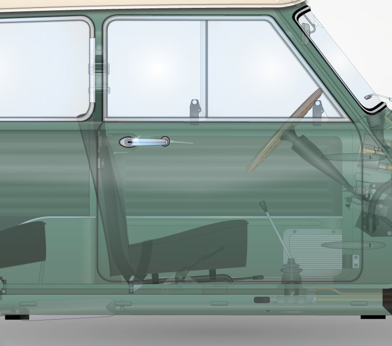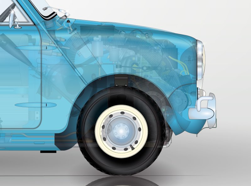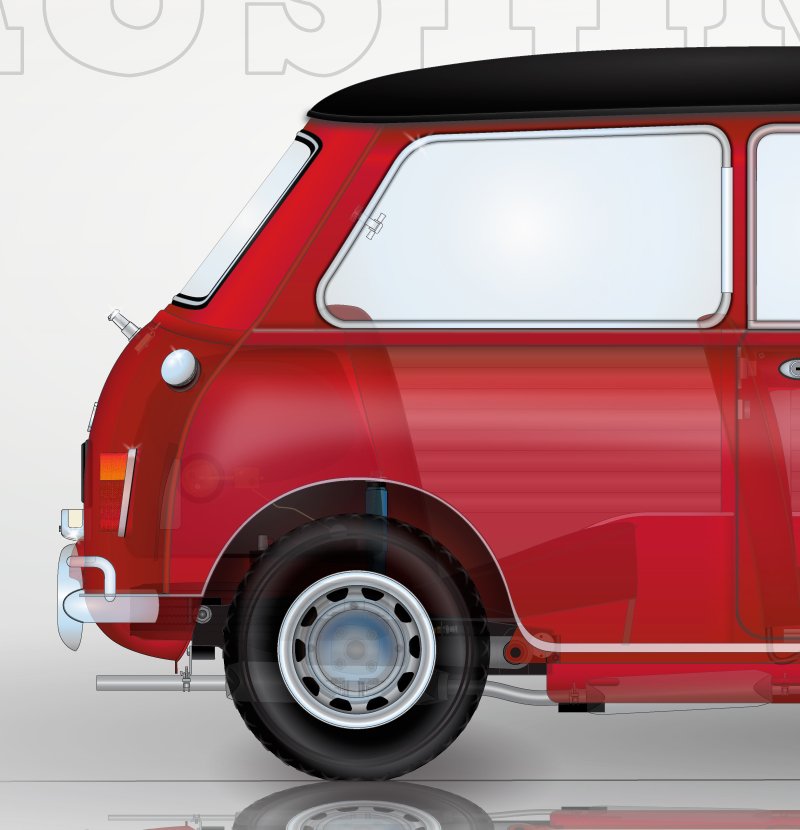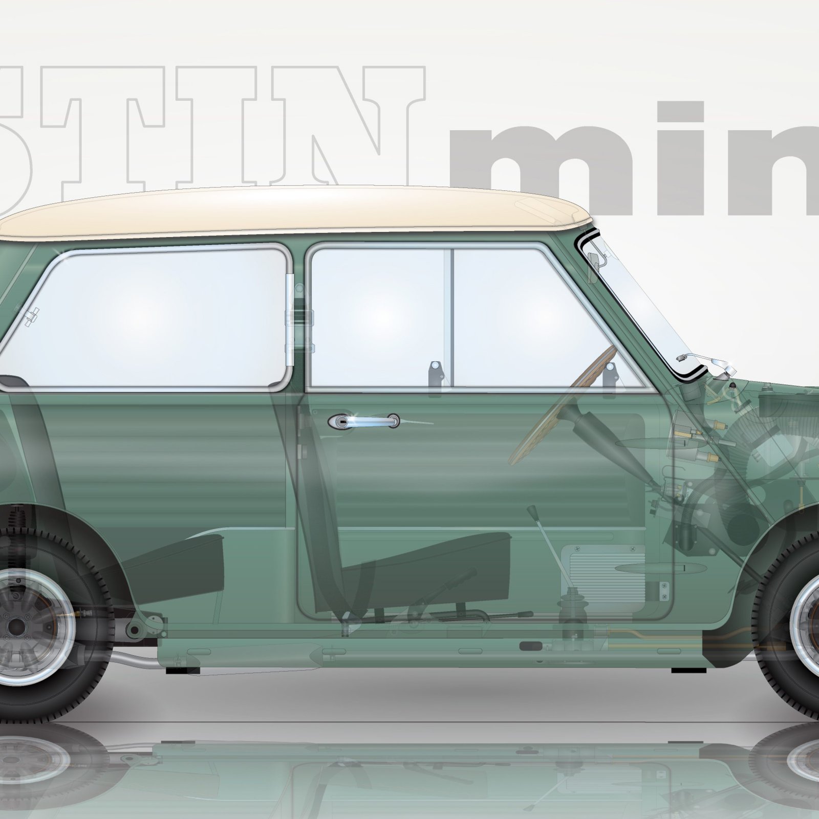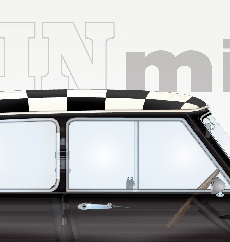 The Sports Car Art Austin Mini-Cooper MK I and Austin Mini-Cooper MKII limited edition fine art prints (only 100 of each will be pressed) come standard in left-hand drive with hydrolastic suspension, factory steel wheels, non-reclining front seats, and no radio or wing mirrors—more or less at it would have come off the showroom floor. You can, of course, option you print with any number of accessories including: