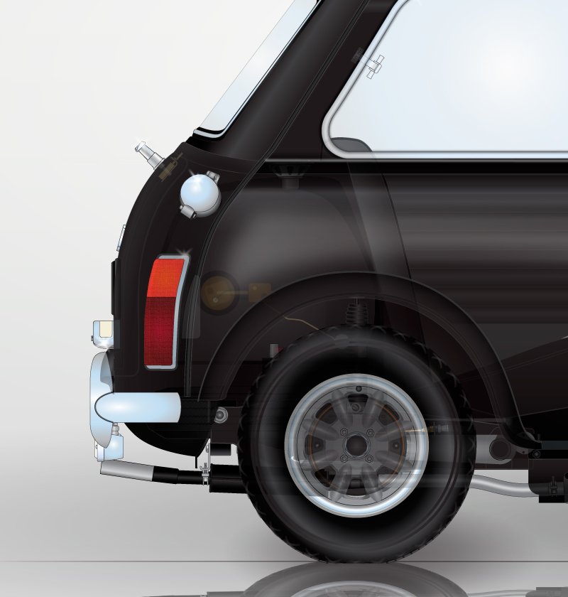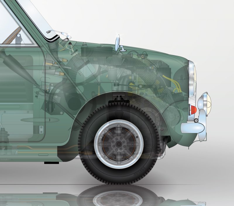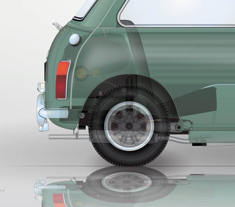 The mighty Mini. While I owned a MKI in my youth, I never really appreciated this marvelous package of engineering until I began the illustration. From the hydrolastic suspension to the transverse mounted motor and gearbox, the Austin Mini-Cooper was quite a revolutionary little car and what would turn out to be, one of the British motorcar industry’s best selling and most iconic vehicles. Not to mention, fun to drive. Like many fine British cars of the era, the Mini’s end came in the early 70s, in large part, because it could not be made to meet the new Federal safety standards. Just as well, I think as British Leyland’s primary solution were the large rubber bumpers found on the MGs and Triumphs of the day.