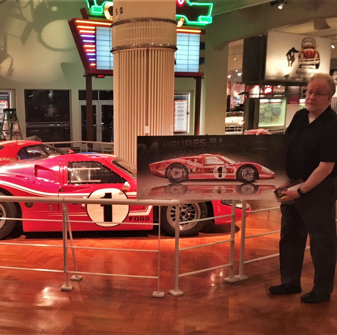 Just too cool for school! Howie from Garage Graphics recently visited the Henry Ford Museum in Dearborn, Michigan and just happened to have (ahem) a spare Gurney signature GT40 brushed aluminum print with him, which he shared with a couple of the curators. General amazement ensued. Pretty cool to see the print in front of the real (albeit reconstructed) #1 car especially because the photo archives at the Ford Museum were absolutely essential in illustrating Dan…