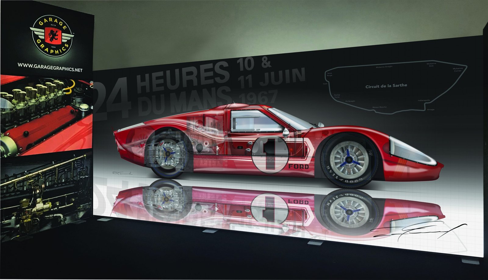 Have you ever had one of those moments when you unintentionally verbalized something you thought you were just thinking? I recently experienced such a moment during my visit to All American Racers. I was standing in Dan’s office with his son Justin and Doug Buchanan from Garage Graphics, looking at a very cool poster from the 1967 LeMans race with a profile view of the GT40 and a black and white image of Dan spraying…