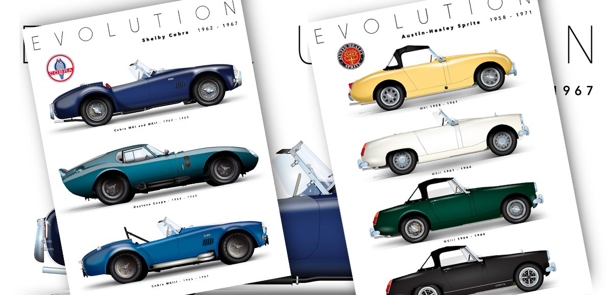 It’s been a while since I’ve introduced any new versions of my popular Evolution print series. With the pandemic restricting travel and more time in the studio than expected at this time of year, I decided to add to the series with two of my favorite cars—the Shelby Cobra and the Austin-Healey Sprite. The Cobra print features the MK I roadster, the Daytona coupe, and the MK III (427) roadster. The Sprite print features Sprites…